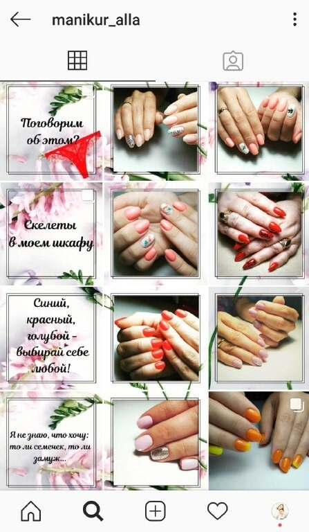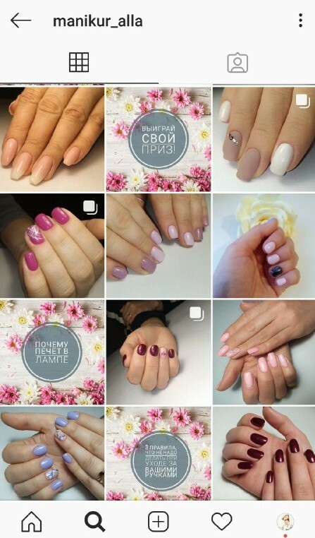 Осложнялось дело тем, что концентрация мастеров маникюра на женскую часть населения военного городка была велика. Но стоит отметить, что никто из конкурентов, не вёл аккаунт профессионально. Как правило, все аккаунты велись однотипно: одни и те же позы рук, одни и те же дизайны ????, а что касается постов - в лучшем случае - куча не работающих на мастера хештегов, а как правило - ничего.